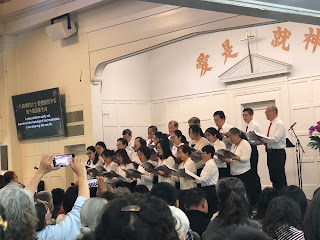 因爲是中英聯合聚會,所以詩歌也是中英輪流唱,聽著旁邊的Olivia唱著和聲,感恩小女孩長大了,也感恩神在這50年中在這教會行了大事。聼創會的周淑慧牧師說,她和吳德聖牧師當時在台灣,神感動他們一家來美國。一開始是查經班,在公寓聚會,後來人數增加,便買下現在的地點。